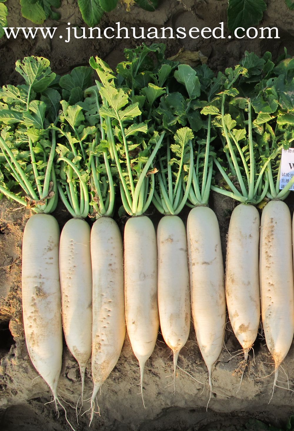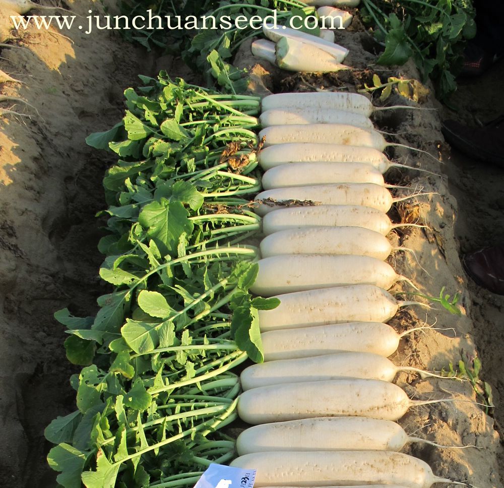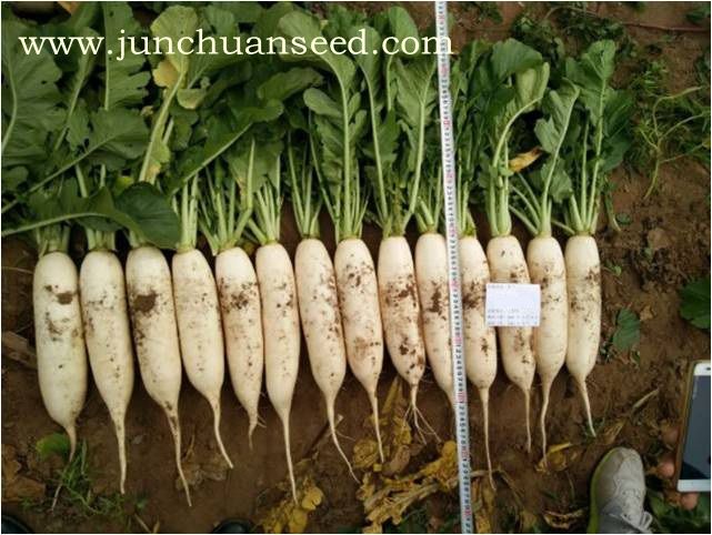 简介: 春秋季种植的新品种,长势强,产量高,叶片半直立,根形顺直、美观,表皮光滑、洁白,播种后55天左右可以采收,生育期内长期低温可能会延迟采收,根茎8cm左右,单根重1.5kg左右。适宜早春保护地、晚春露