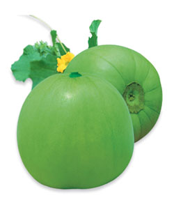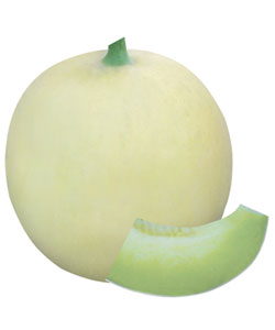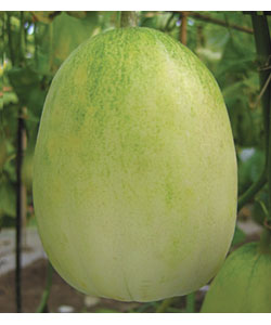 简介: 中熟,果实成熟期40天,果圆球形,白光皮,偶有网纹,绿肉,含糖量17%,心室小,肉厚,汁多,品质优质脆,风味好,单瓜重2-2.5kg,抗性强,商品性好。