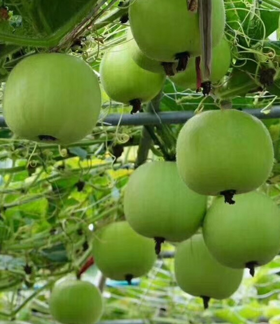 简介: 特征特性: ❀. 杂交一代小型冬瓜,中晚熟。 ❀. 瓜扁球型,头尾整齐,皮浅绿色,肉质致密。 ❀. 植株生长旺盛,抗病性好,座果能力强,耐贮运。 ❀. 味爽脆