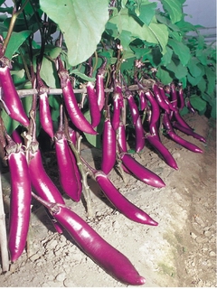 | 简介:杂交一代,早熟品种,抗病力强,生长强健。定植后38天可采收,分枝较多,座果力特强,果实长棒形,长约40厘米,果皮红紫色,富有光泽,皮薄肉厚,质细微甜,单果重可达250克。 |