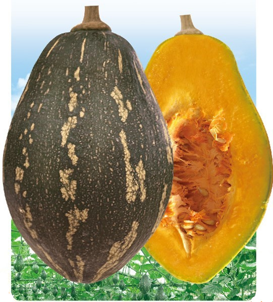 简介: 中早熟,易结瓜。瓜榄核形,长约23厘米,横径约13厘米。单瓜重约1.0-1.5公斤,成熟瓜橙黄色,有深绿色花纹,瓜肉金黄色,肉质致密,水分少,味道香甜,有香芋味,品质佳。