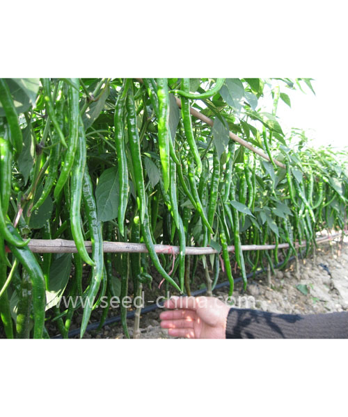 简介:品种主要性状:最新选育的中熟,高产、深绿色线椒组合。植株生长势强,分枝多,连续座果能力强,三亚试验基地田间观测:株高一般70cm左右,开展度65cm左右,果实长羊角形,果长26cm左右,果宽1.8cm左右