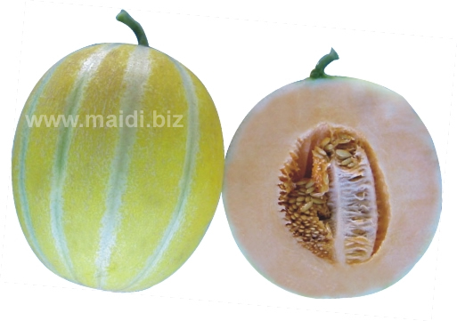简介:早熟,高档甜瓜品种,植株生长势中等,全生育期70-75天,果实发育期35天左右,高圆形,白皮覆绿条斑,果面光滑,浅桔红肉,质脆,含糖量15%-17%,单果重约2-2.5千克,植株抗逆性较强。