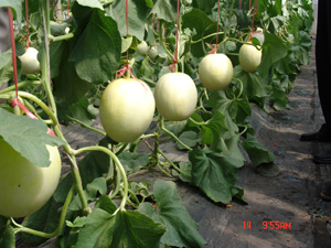 简介:极早熟品种,植株长势中等,抗病性强,座果容易,果实发育20天时,果皮就成乳白色,25天后上淡黄色黄晕(成熟时的明显标志),果实正圆球型,果肉亮白,肉厚子腔小, 单瓜1.2—1.5kg,口感香甜,品质极佳,