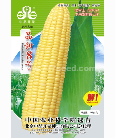 简介: 品甜8号是中国农业科学院作物科学研究所育成的水果型超甜玉米杂交种。2006年通过天津市审定,审定编号津审玉2006024。该品种在华北地区出苗至鲜穗采收90-95天左右,在淮海地区出苗至鲜穗