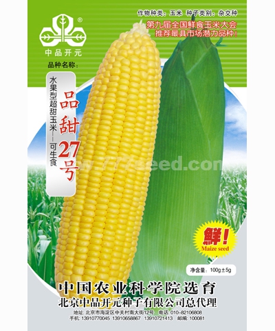 简介:品甜27号特征特性:北京春播出苗至鲜穗采收85天,夏播75天。株高240cm,穗位100cm,穗长22cm,穗粗5.5cm,穗行20行,突尖2cm,粒深1.2cm。粒色浅黄色,穗型长锥型,保绿度好抗病抗倒。亩产2800斤。是籽粒