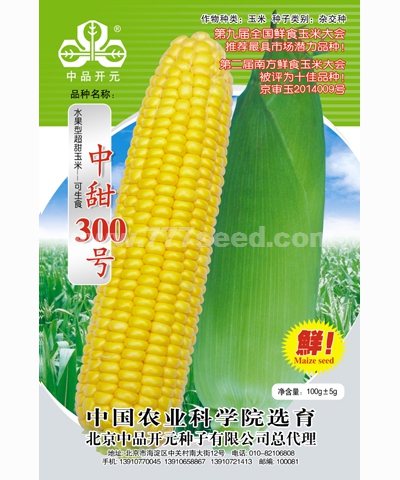 简介:中甜300号特征特性:北京地区出苗至鲜穗采收春播85天,夏播75天。株型半紧凑,株高220cm,穗位75cm,穗行14-16行,穗长22,穗粗5cm,穗轴白色,粒色黄色,粒型半马齿 。栽培密度3000株/亩,亩播量1.75公