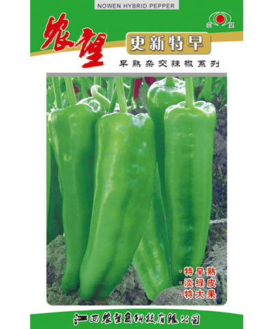 | 简介:品种:更新特早是江西农望高科技有限公司育成的一代杂交辣椒品种,其突出特点是:早熟性好,耐低温、弱光,果实膨大快,皮色淡绿,质地脆嫩,果大,是早春抢早市栽培的首选品种,亦可作秋延栽培。特征特 |