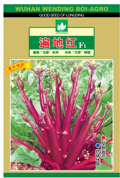 简介:特征特性: 遍地红是文鼎农业公司最新推出的早熟、丰产、优质杂交一代新品种,2004-2005年武汉郊区试种表现优良。从播种至采收60-65天,生长较强,莲座叶中等,采苔粗壮,紫红色鲜亮无蜡粉,长35cm左
