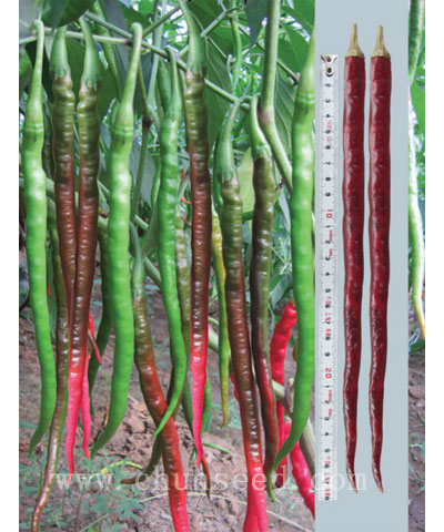 | 简介:特征特性: 早熟,绿色长条椒王,最长30-32cm,一般24-28cm,粗1.6-1.8cm,株高65cm左右,开展度68cm,果顺直光亮,分枝强,结果多,一致性好,后期果多,而且长,不缩短,味辣,商品性好 |