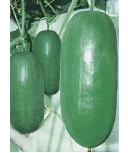 简介: 杂交一代。早熟、抗病、优质、丰产。瓜皮青绿色,被茸毛,有光泽,果实炮弹形,果实纵径60cm左右;横径18cm左右,单果10kg。肉厚质密,心室小,味粉甜、耐贮运。产量约8000kg/667㎡。