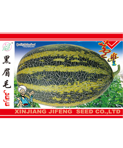 简介:黑眉毛属中晚熟品种,生育期110天左右,果实椭圆形,单瓜重3.5-4公斤,亩产可达3吨,成熟后果柄脱落,生长期果实为青绿色,成熟后果实为黄绿色,网纹布满全瓜,果面有类似人眉毛的墨绿色条斑,肉质细